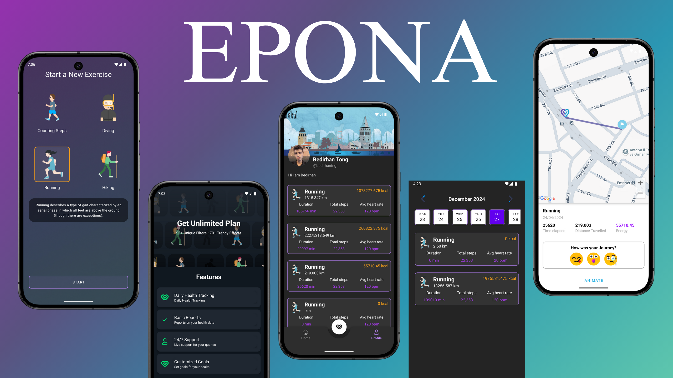 EPONA is a personal health tracker Android application. The application allows the user to monitor the performance for various activities such as running, step counting, diving, breath taking.
